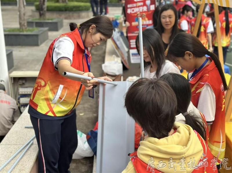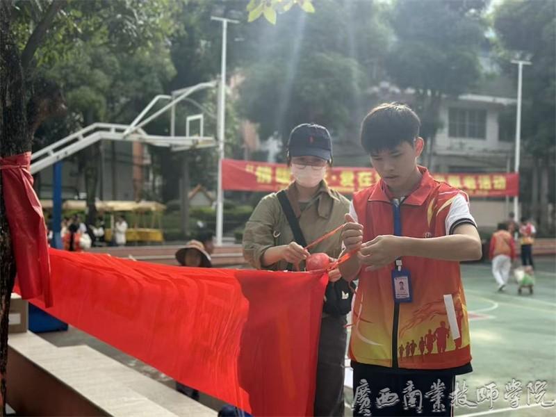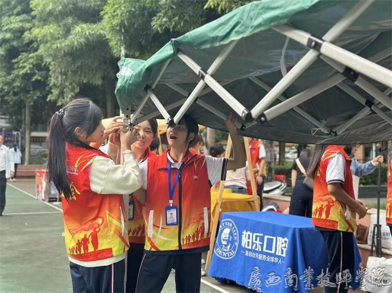 在活动筹备阶段,我院南宁教学点30名学生会志愿者主动协助社区布置场地,以高度的责任意识与奉献精神投入工作:有的细致悬挂活动横幅,有的默契搭建帐篷,有的积极搬运饮用水与座椅,全力为社区长者营造舒适安全的环境。志愿者们分工明确、协作高效,既彰显了新时代青年学生的良好风貌与志愿服务意识,也为活动顺利开展奠定了坚实基础。