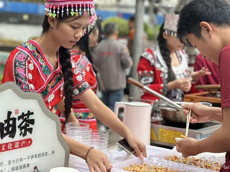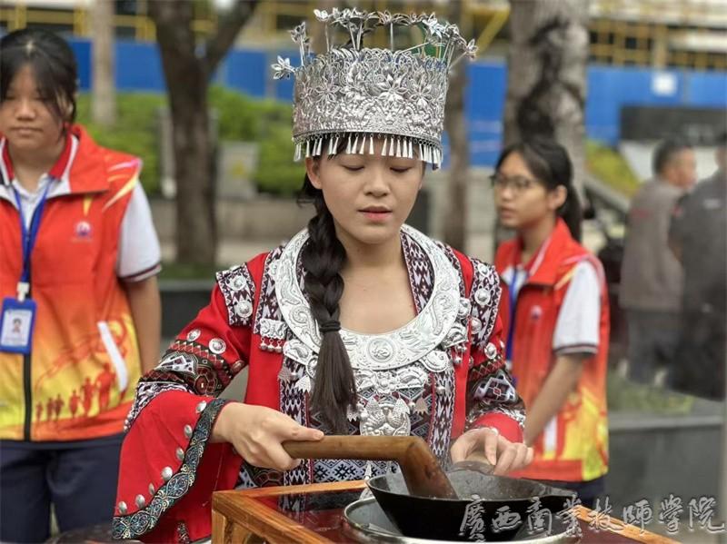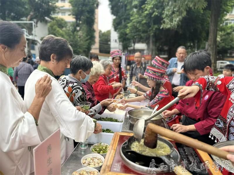 活动现场,我院南宁教学点油茶社团的摆台成为亮点。社团成员们身着民族服饰,有条不紊地进行炒茶、捶打、煮制等工序,浓郁的油茶香气在广场上飘散,迅速吸引大批长者驻足。有的长者凑到摊位前仔细观看炒茶、捶打工序,有的主动询问制作技巧,社团成员们耐心讲解油茶的制作工艺与文化内涵,还将煮好的热油茶递到长者手中。长者们抿着温热的油茶,脸上露出笑容,在品尝美味的同时,深切感受传统饮食文化的独特魅力。