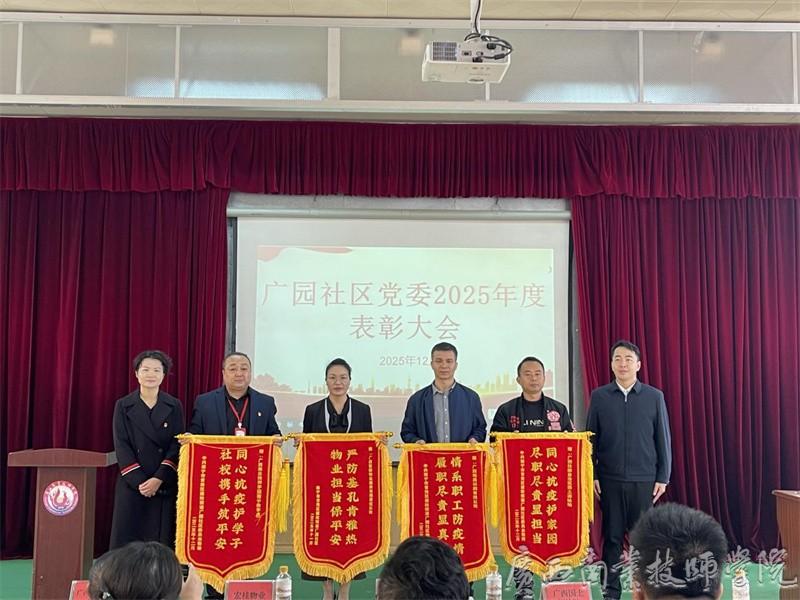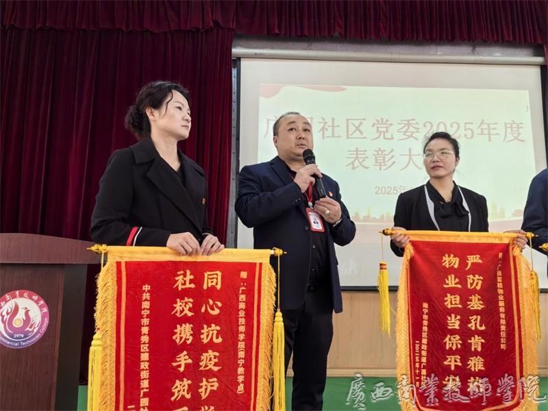 12月19日,在中共南宁市青秀区建政街道广园社区委员会2025年度“大党委”表彰大会上,广园社区向广西商业技师学院南宁教学点赠送锦旗,表彰学校在基孔肯雅热疫情防控工作中给予社区的支持与贡献,生动诠释了校社共建、同心抗疫的责任担当与深厚情谊。